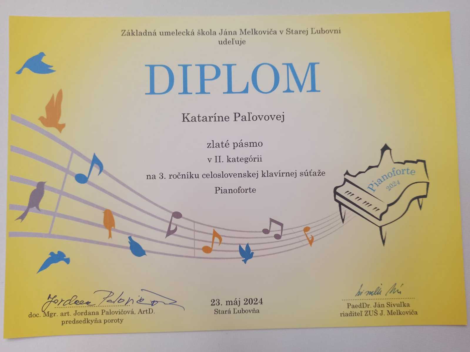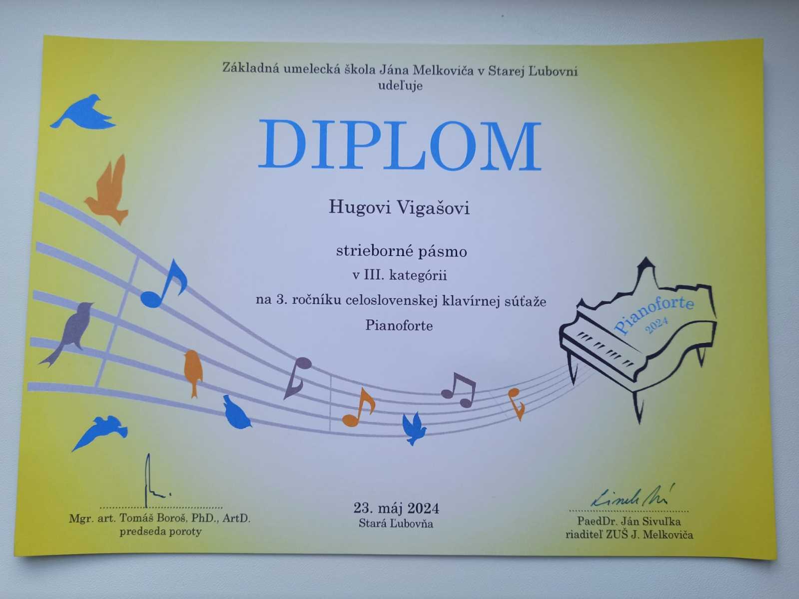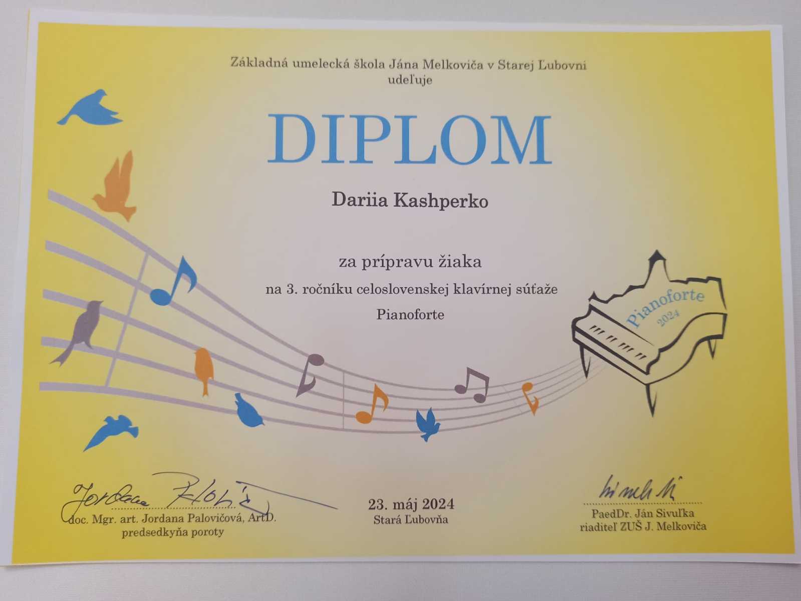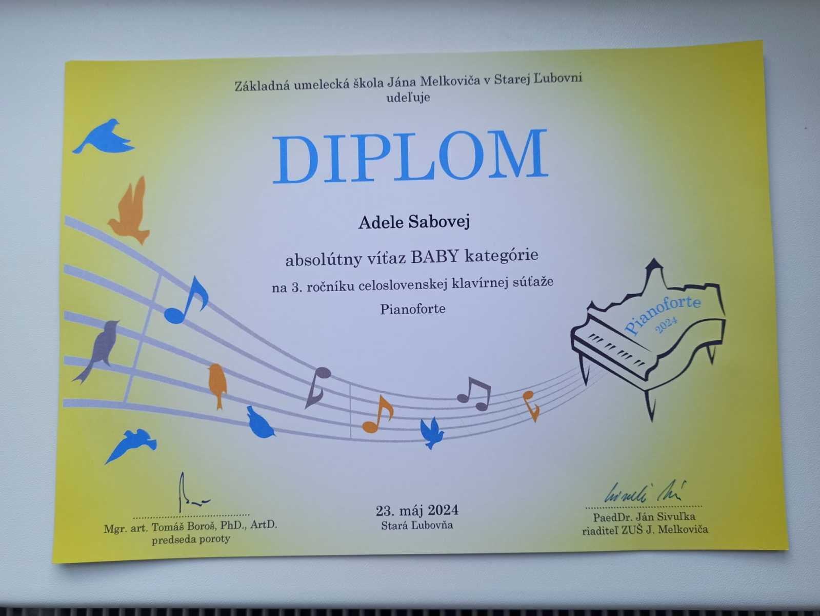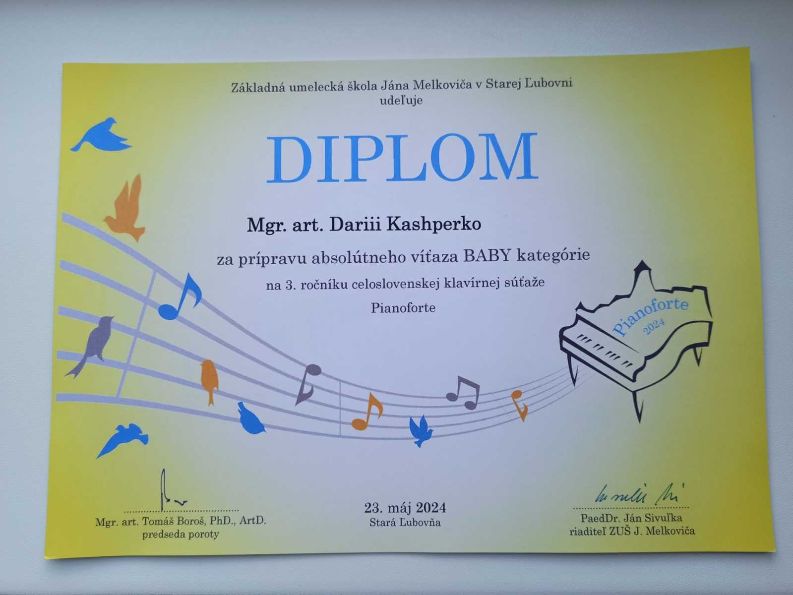 Pianoforte 2024 Celoslovenská klavírna súťaž5. júna 202425. marca 2026 Laureát súťaže v kategórii BABY- Adelka Sabová 1.miesto Katarina Paľovová a 3.miesto Hugo Vigaš. P.uč.Daria bola tiež ocenená za najlepšieho pedagóga. Všetkým srdečne gratulujeme.