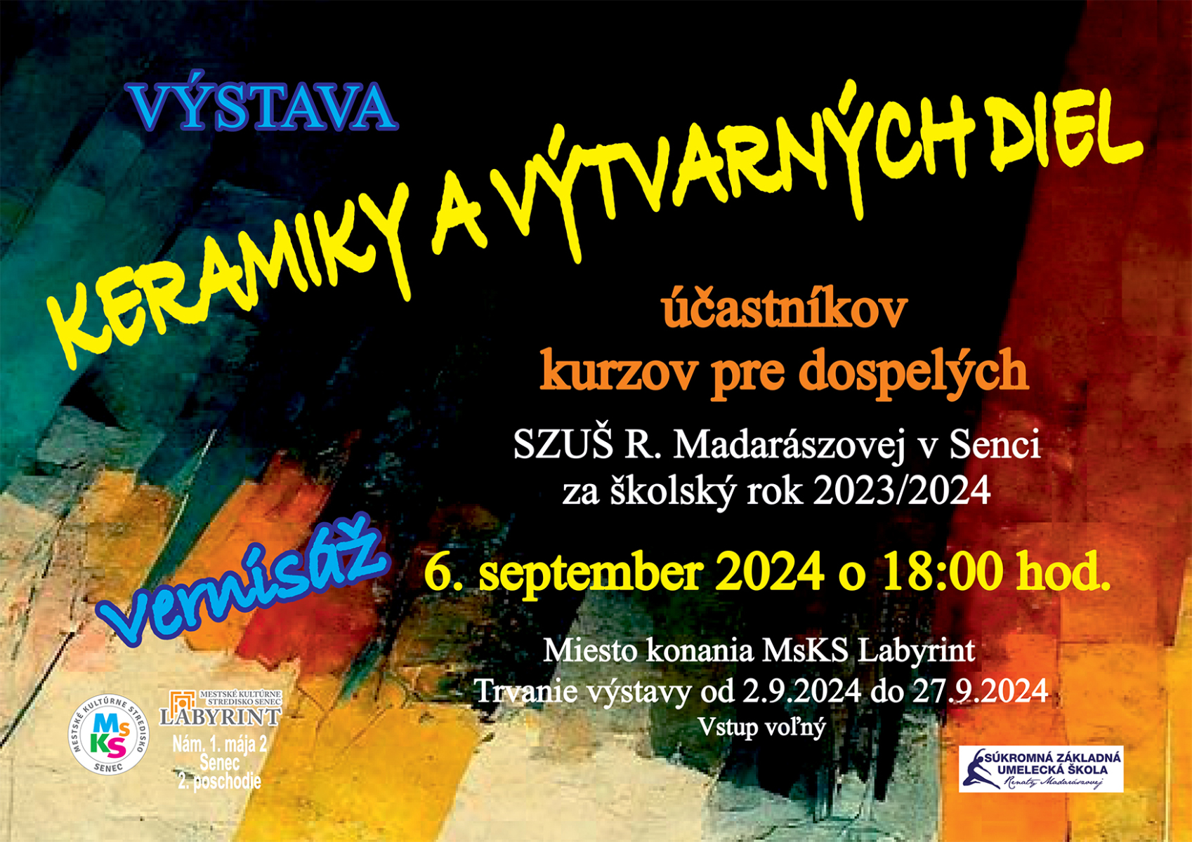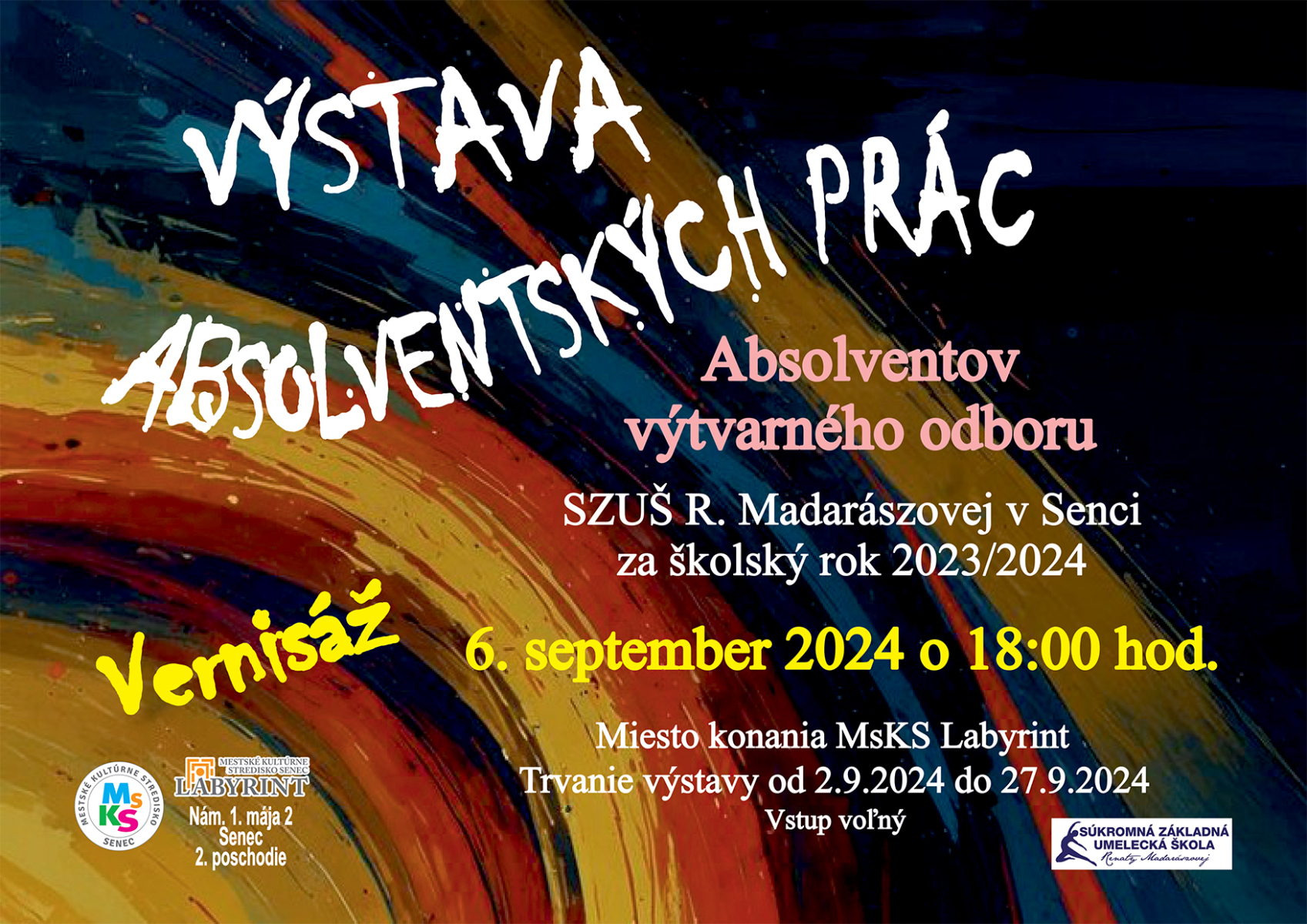 Vernisáž výstavy absolventských prác absolventov výtvarného odboru SZUŠ R. Madarászovej sa uskutoční v piatok 6.9.2024 o 18:00 hod. v Labyrinte na 2. poschodí.Na výstave nájdete aj práce dospelých, ktorí minulý školský rok navštevovali výtvarmý kurz našej pani učiteľky Janky Ogurčákovej.