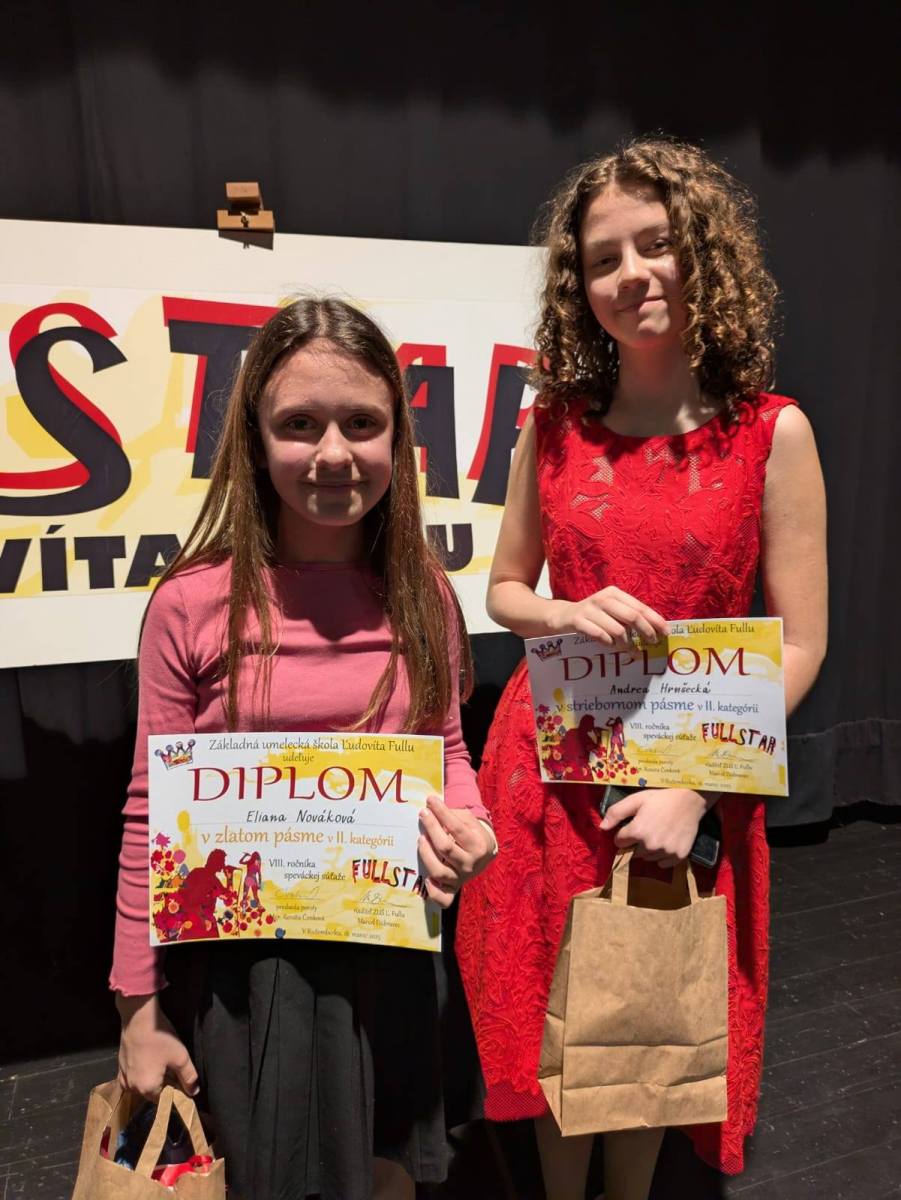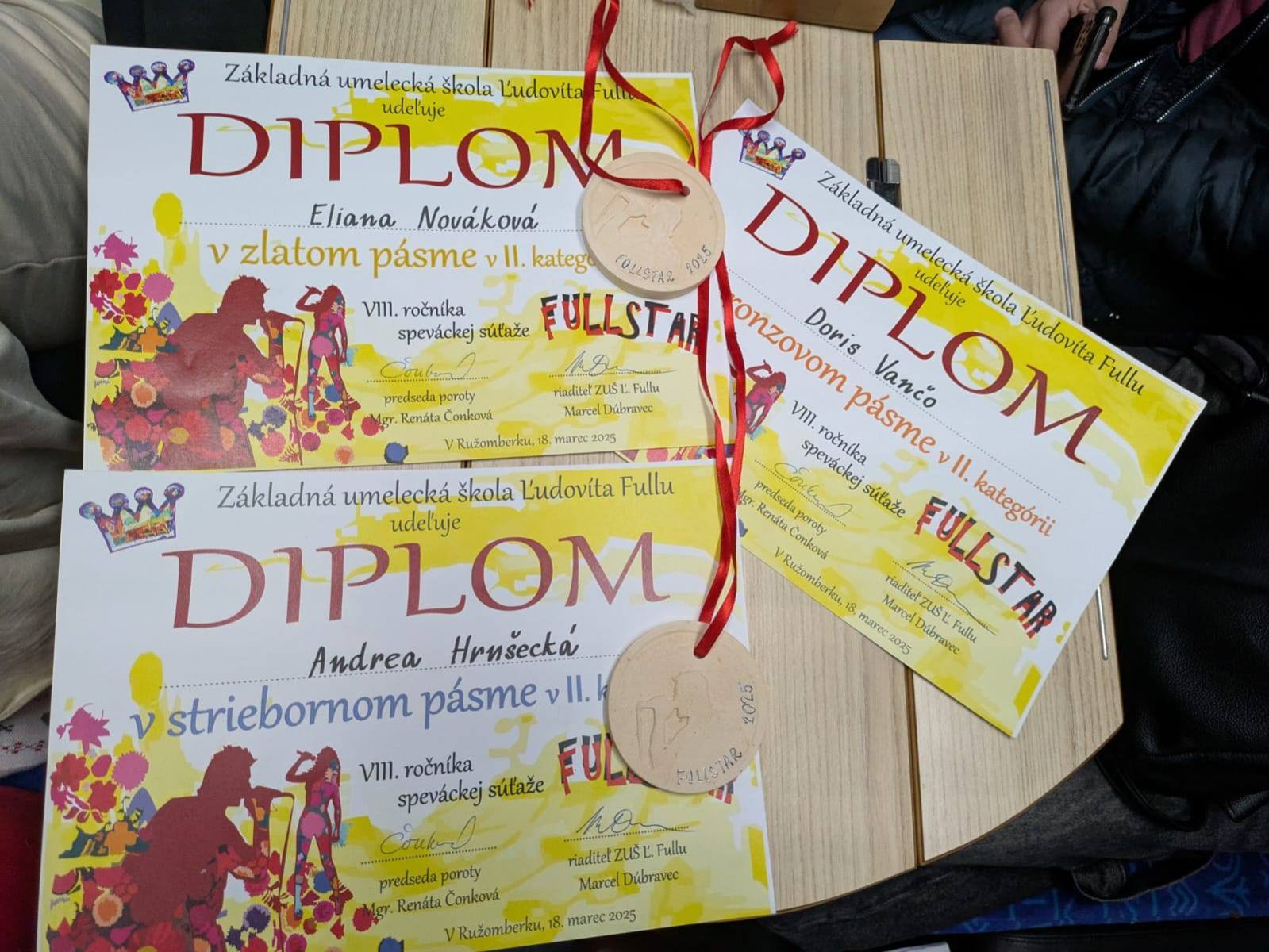 Spevácka súťaž Fullstar19. marca 202525. marca 2026 Naše dievčence na speváckej súťaži Fullstar získali krásne ocenenia. Gratulujeme a ďakujeme žiačkám a aj p.uč. Bc.& Bc. Monike Põcze, ktorá ich pripravovala. Elianka Nováková – zlato Andrejka Hrušecká – striebro Doris Vančo – bronz